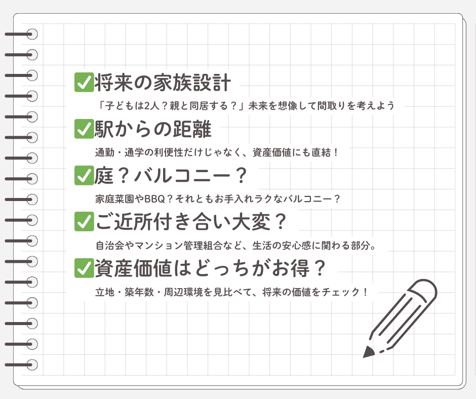 マンションと戸建てにはそれぞれメリット・デメリットがあるため絶対にこっちを選んだ方がいいという答えはありません。したがって、「何を優先するのか」によってマンションか戸建てかの判断は変わってきます。